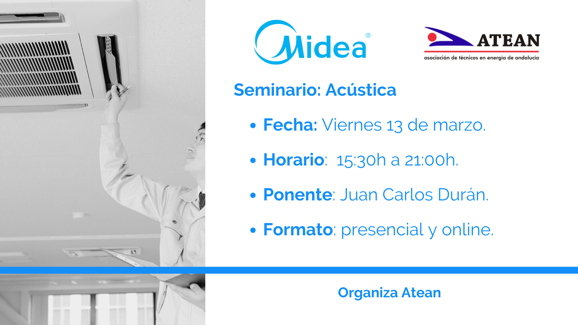 Te invitamos al próximo Seminario sobre acústica que, con el patrocinio de nuestro Socio Protector MIDEA, organizará ATEAN. Dicho Seminario lo celebraremos en la sede de EPYME, en la calle Américo Vespucio, 23 en la Isla de la Cartuja, de SEVILLA, en formato presencial y online, el día 13 de marzo 2026.